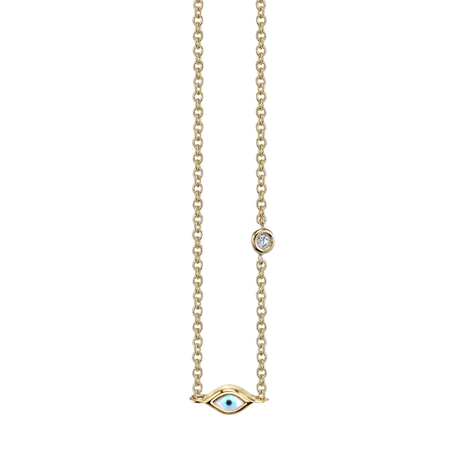 Protect yourself from the malevolent glare by wearing these yellow gold with diamond and sapphire Evil Eye chain necklace from Sydney Evan.