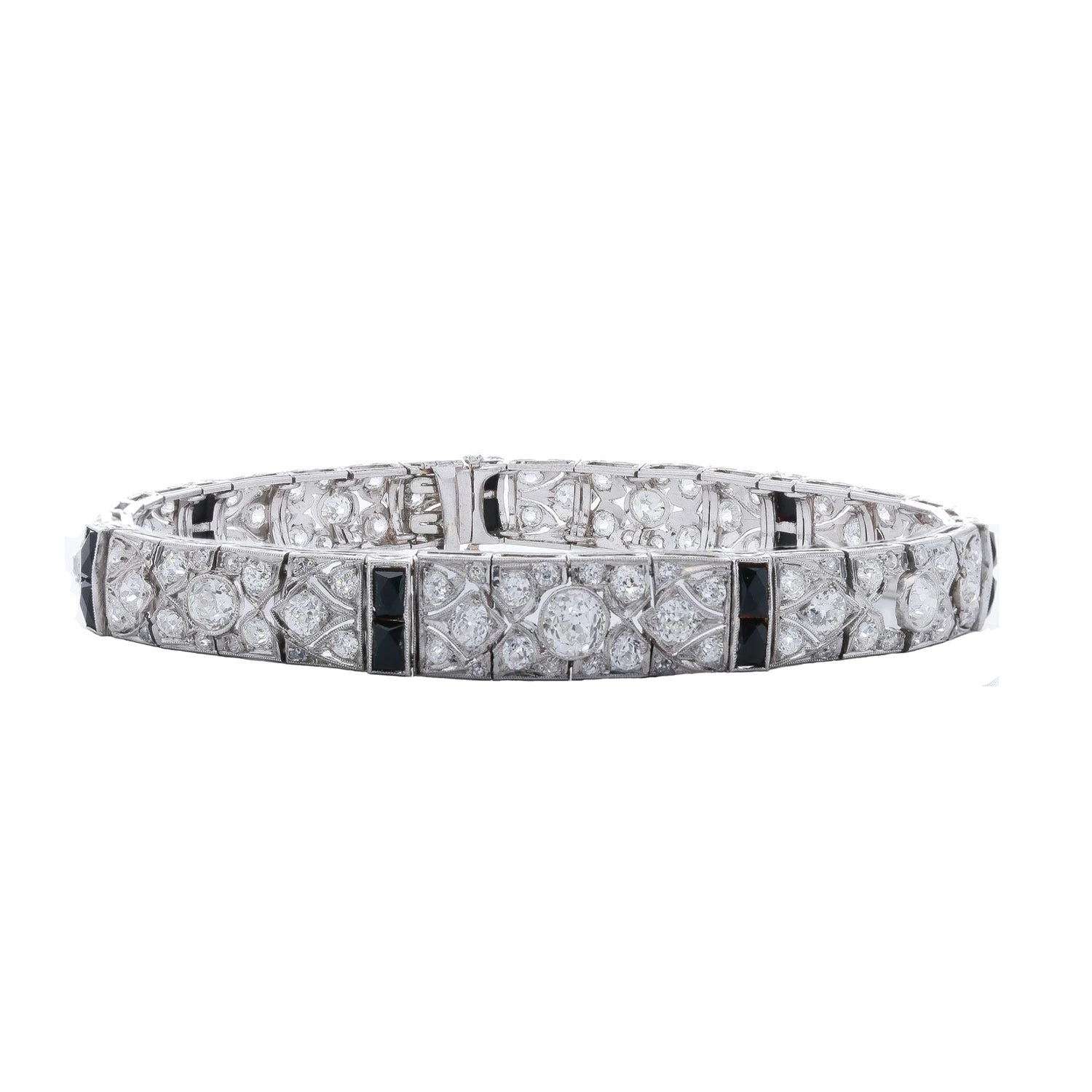 Relive the glory days of times gone by with the Art Deco Platinum Diamond & Onyx Filigree Panel Bracelet from Fred Leighton.