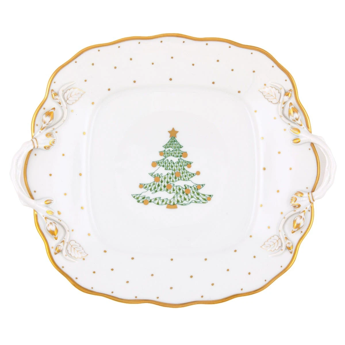 Individually hand painted, each piece of Herend porcelain is a unique work of art. The Christmas Tree Square Cake plate is decorated in Herendβs signature fishnet design in the shape of a tree with 24 carat gold details, making it a unique collectable.
