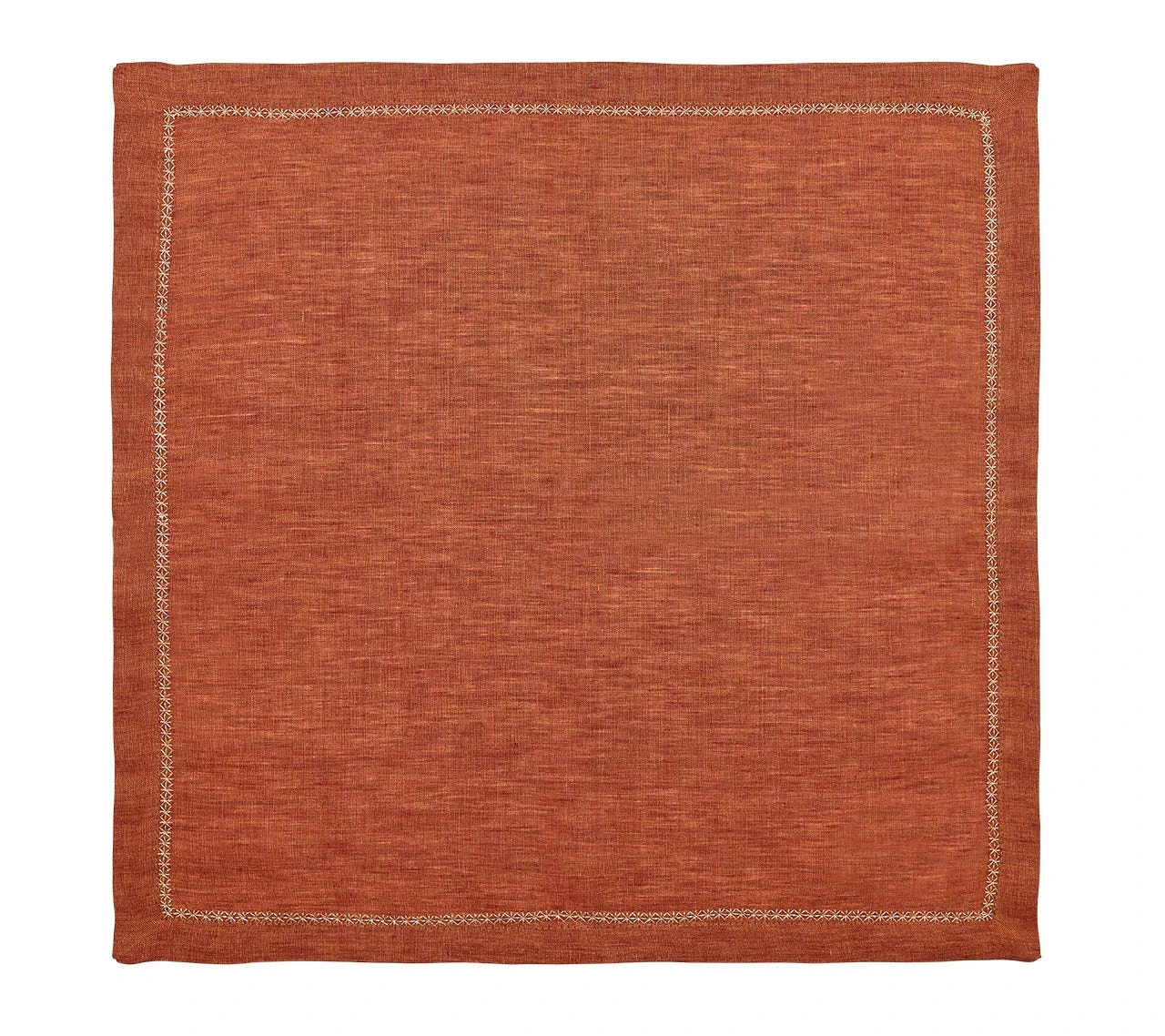 Elevate the table with our Classic Napkin in Rust color from Kim Seybert. This 100% linen napkin is great for adding a pop of color–and a touch of elegance. This Classic Napkin has a delicate border with expertly embroidered gold stars.