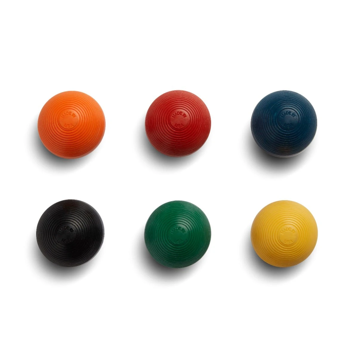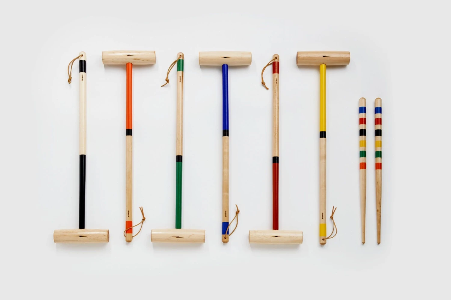 This Shinola Croquet set includes six custom-colored poly balls, six custom-striped and branded mallets with 30” handles, nine powder-coated wickets, two 24” goal stakes, and a USA-made navy canvas carrying tote.
