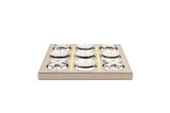 The stunning Dedalo Rectangular Tray from Pinetti is crafted from smooth Italian calfskin leather in a gorgeous shade of taupe. The rectangular silhouette is complemented by two leather handles with chrome finishes, adding a special shine and creating a contrast. The Dedalo Rectangular Tray is available in three sizes. The small version measures 8 by 12.2 inches, the medium comes in at 11.6 by 17.7 inches, and the large provides ample coverage, measuring 15.75 by 22.6 inches.