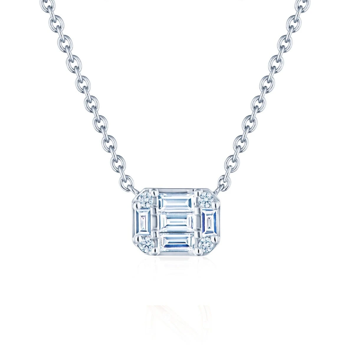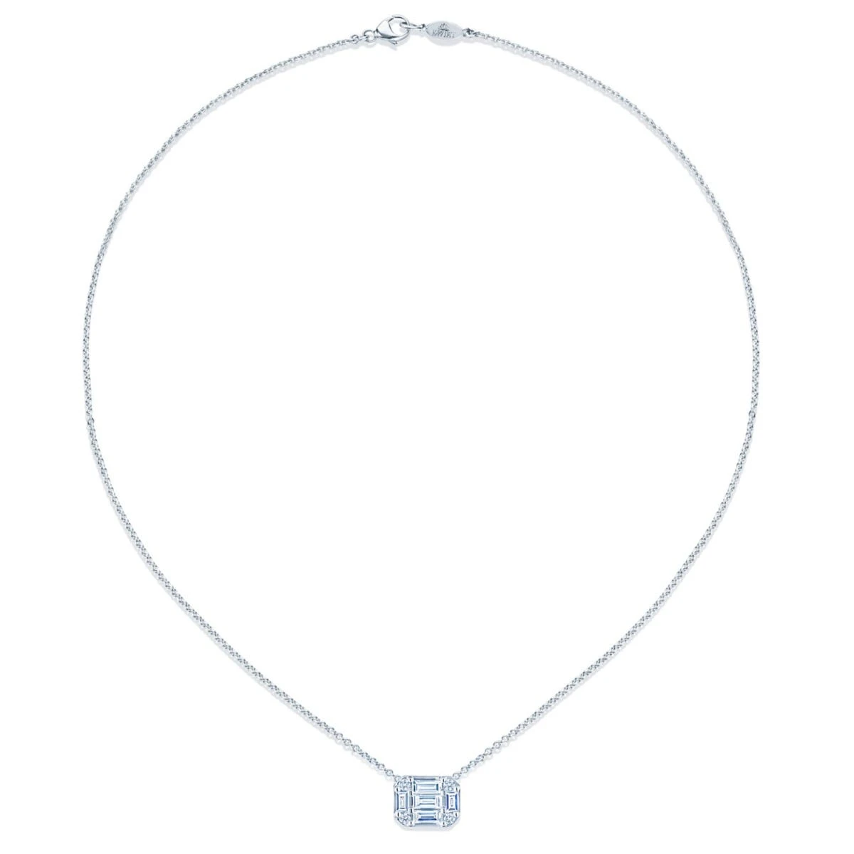 A mélange of emerald-cut and round brilliant diamonds fit together like puzzle pieces to create the effect of a larger emerald-cut stone. Each one is absolutely dazzling, thanks to Kwiat’s peerless cutting standards. Bezel set in 18k yellow gold, this pendant is a modern classic that’s easy to wear every day.