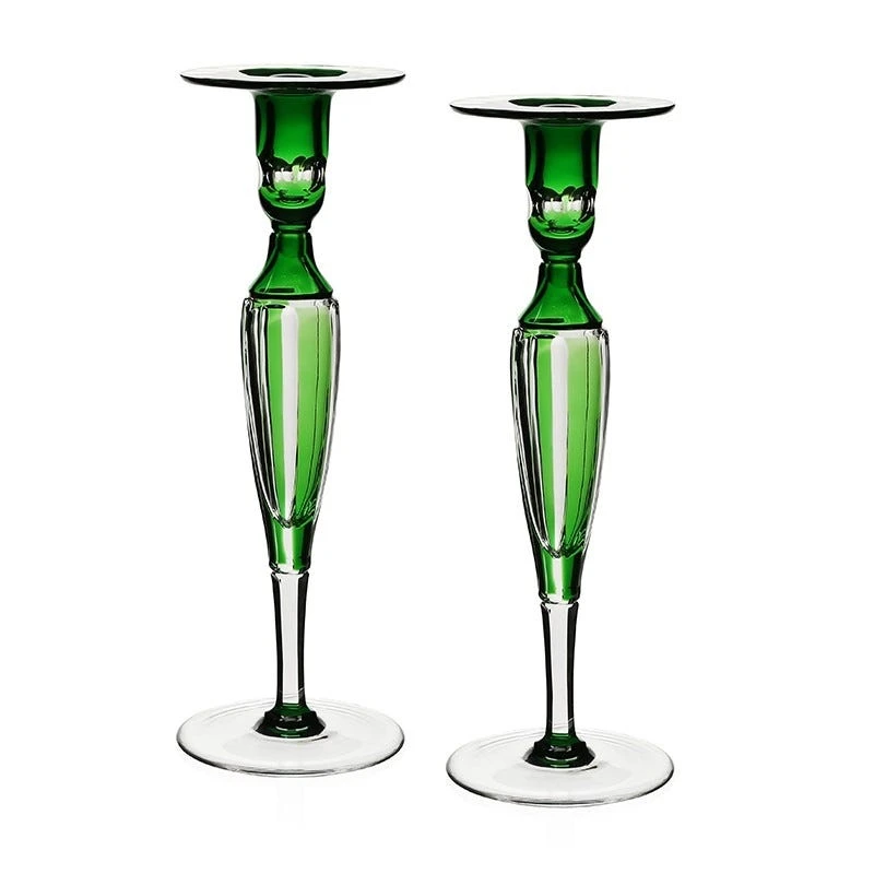 A true conversation piece, these brilliant handmade crystal candlesticks from William Yeoward have striking emerald colored accents.