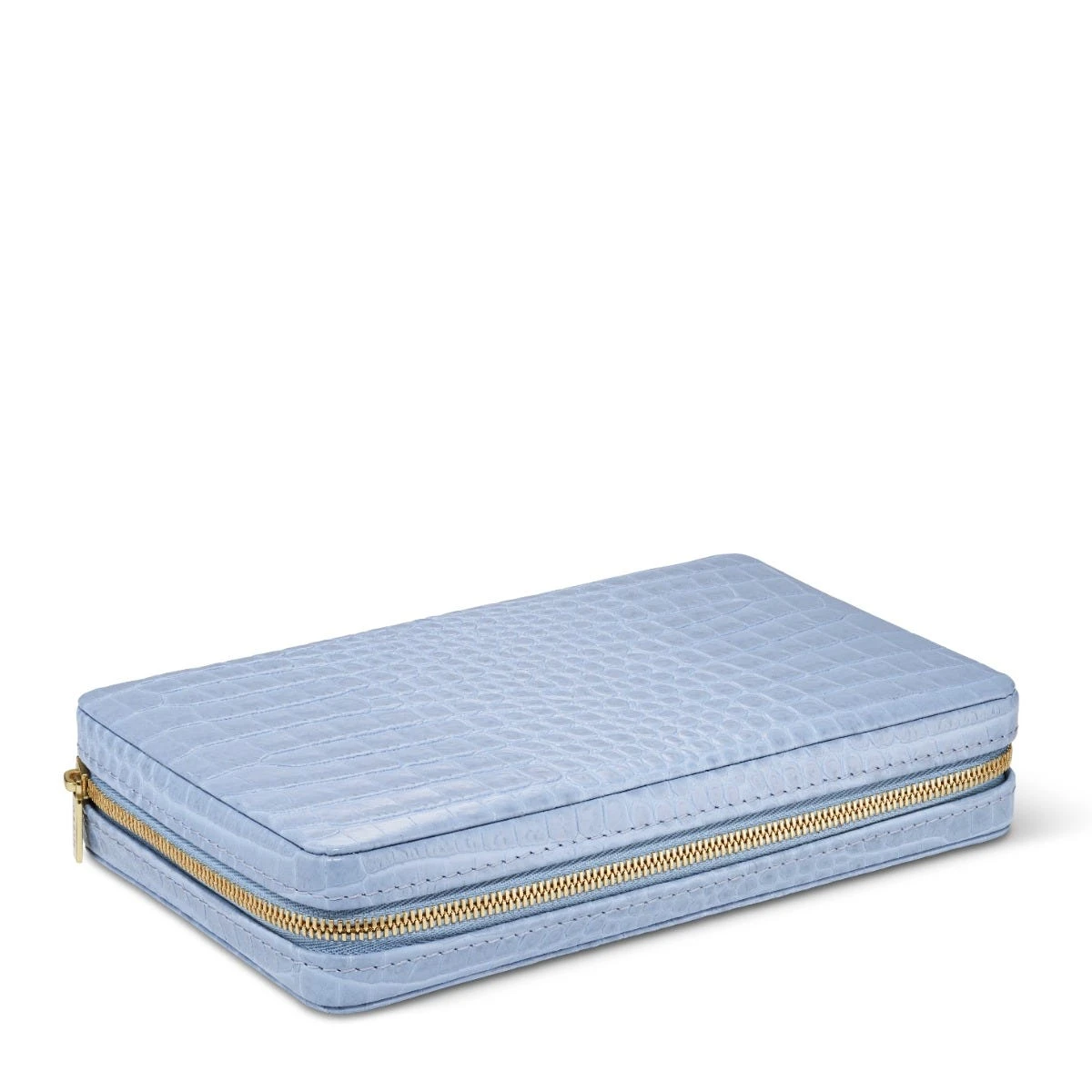 Designed by AERIN, this Enzo Travel Domino Set features a beautiful case crafted in Italian Croc Embossed Leather in a hydrangea blue hue. Perfect for games on the go, this set of Double Six Dominoes with brass spinners come complete with a zipper for convenience and can be stored in a carry-on bag, on a tabletop, or book shelf at home.