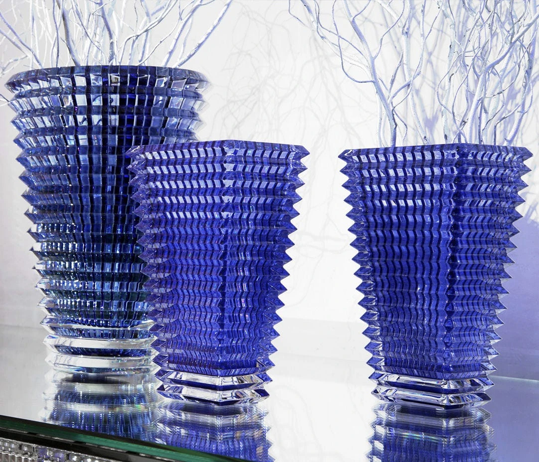Graduated rings of faceted French blue crystal make the stunning Baccarat Eye vase sparkle.