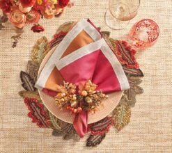 The Fall Frolic Napkin Ring in brown & orange from Kim Seybert instantly sets the mood for a fall celebration. Pine cones, berries, faux leaves, and branches entwine to create a festive arrangement for this seasonal “must-have.”