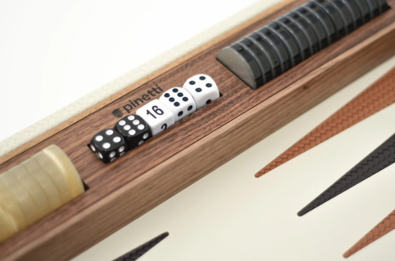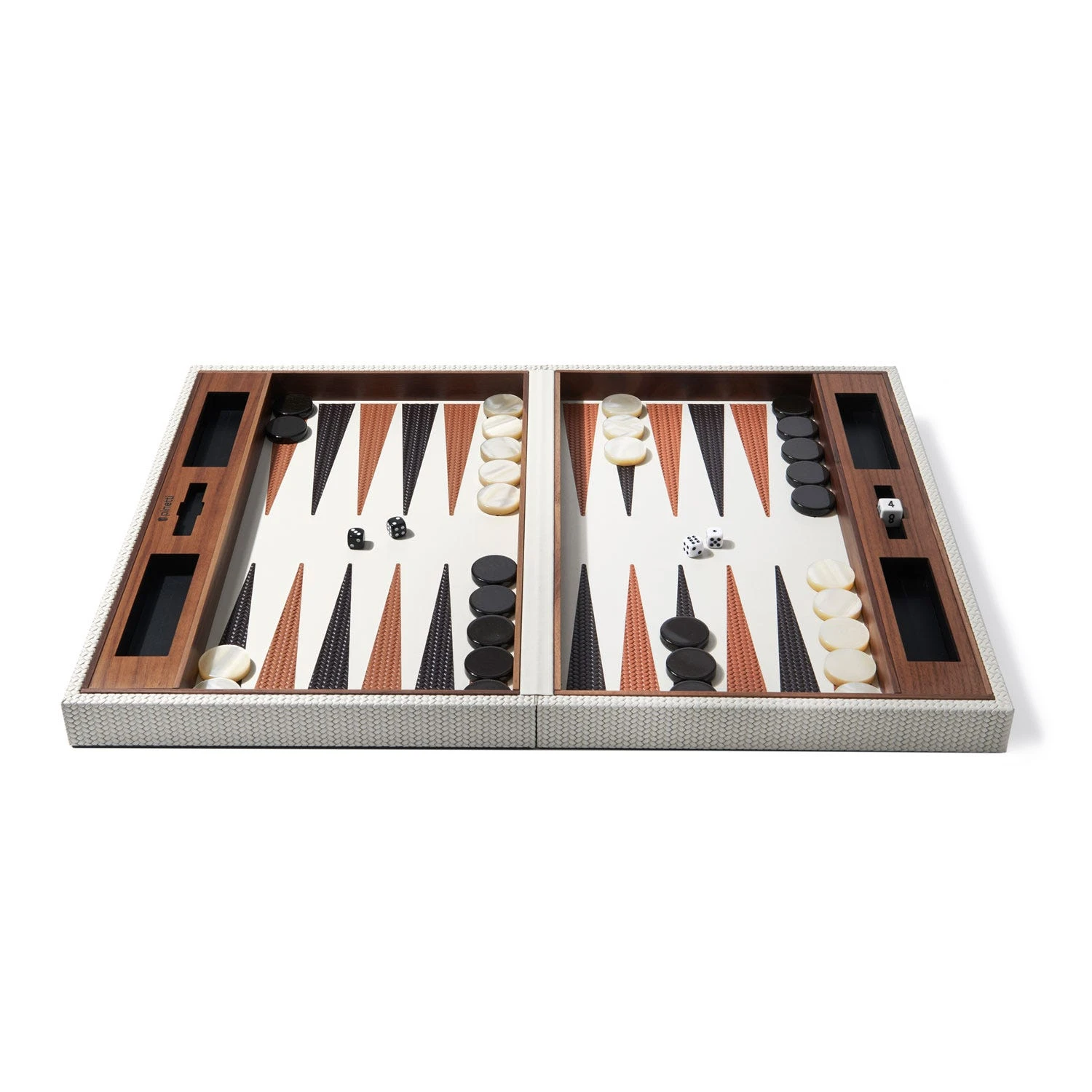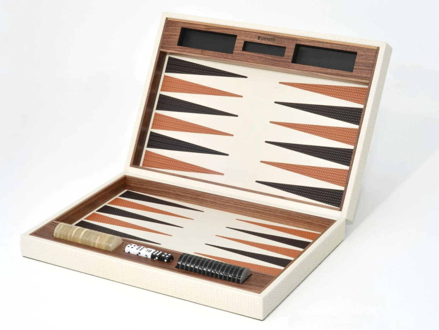Let the games begin! The Firenze Backgammon Set from Pinetti elevates this classic game to a new standard. The braided Italian leather exterior and stunning wood detailing will provide hours of fun in sophisticated style. The Firenze Backgammon Set makes a great holiday gift, perfect for whiling the hours away on a cozy afternoon. The backgammon set measures 23.63 inches wide by 16.9 inches deep when open.
