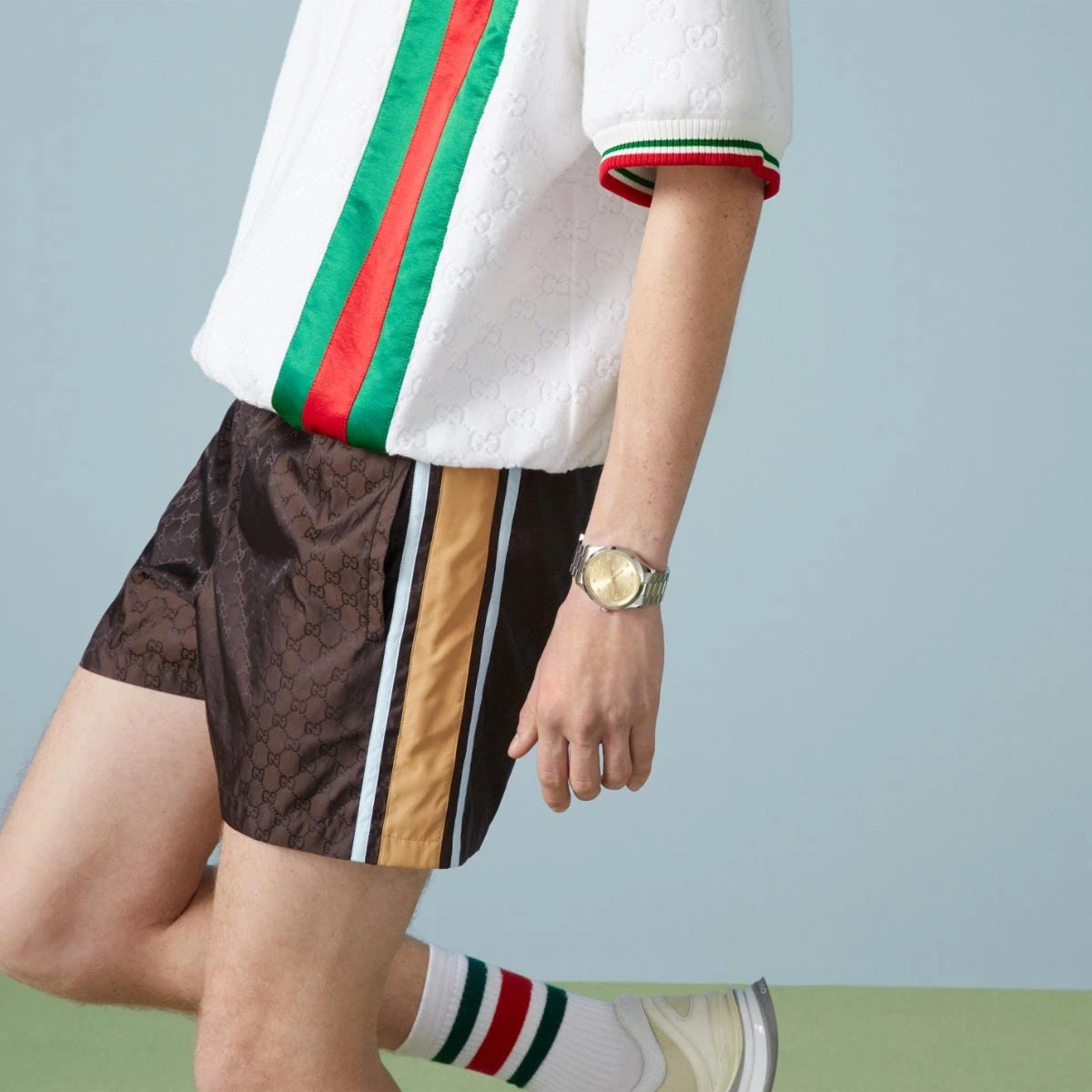 The Gucci bee, a historical symbol from the ’70s archives, is combined with a yellow sunbrushed dial and a steel bracelet. The G-Timeless collection combines classic design details with a contemporary aesthetic to create elevated watches with a timeless feel.