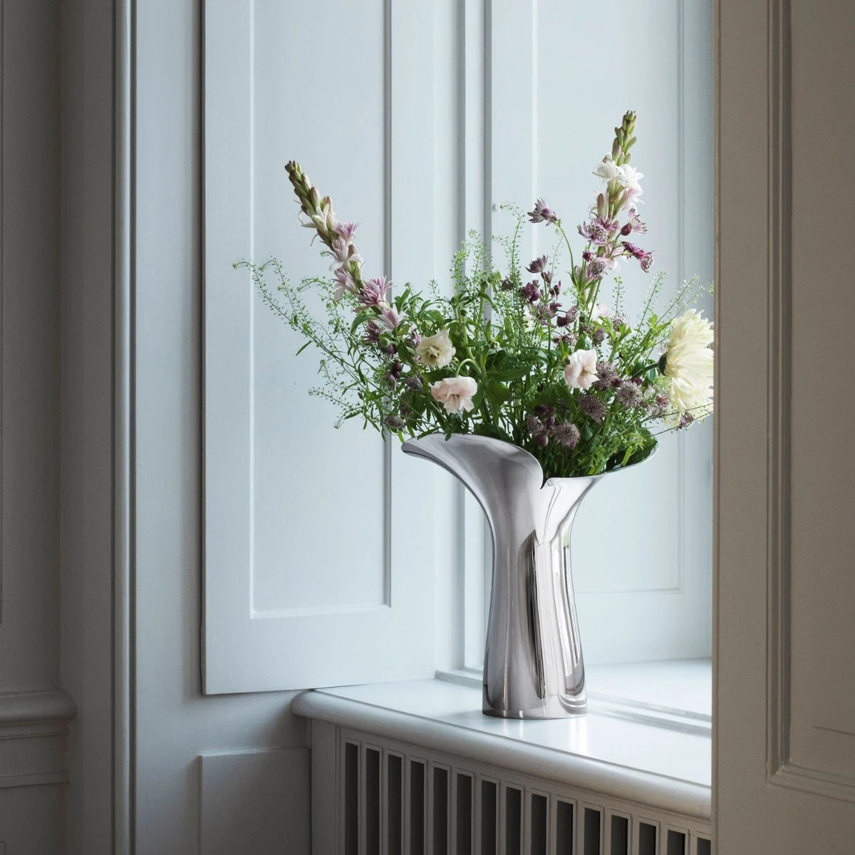 Inspired by the ethereal moment when a flower bud bursts open to reveal the petals within, the large Bloom Botanica Vase reveals the exuberant energy of springtime. Superbly crafted with a mirror-polished finish, this elegant flower vase brings a strong design element to any interior decor. Whether placed on a dining table, shelf or windowsill, designer Helle Damkjaer’s exquisite craftsmanship and artistry shine forth. With her unusual way of creating, the danish designer meticulously handcrafts each new shape from clay to make sure it exactly fits the shape she desires. The huge success of the Bloom Collection by Georg Jensen can be explained by the distinctive warmth produced by her approach.