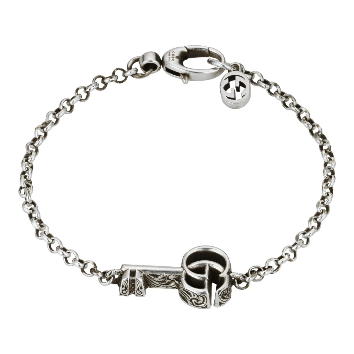 925 Sterling silver – Made in Italy Double G key with arabesque engraving Clasp closure |