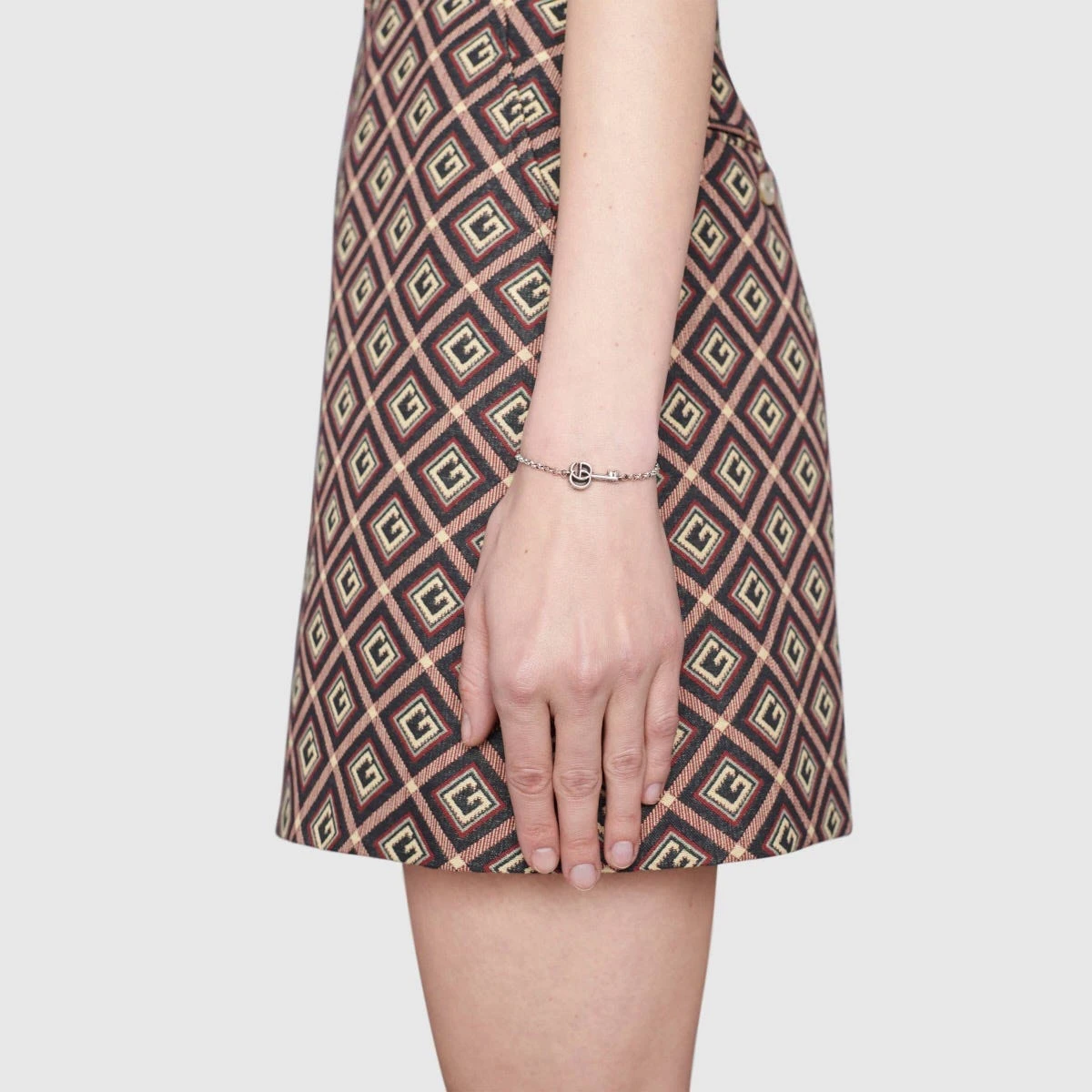 The Gucci GG Key Marmont sterling silver bracelet features an aged finish, and includes a key pendant adorned with Gucci’s famed double G emblem. The key is engraved in arabesque style, giving it a textured look. Handcrafted in Italy, this elegant bracelet adds flair to any look and works wonderfully as a standalone piece or with other accessories.