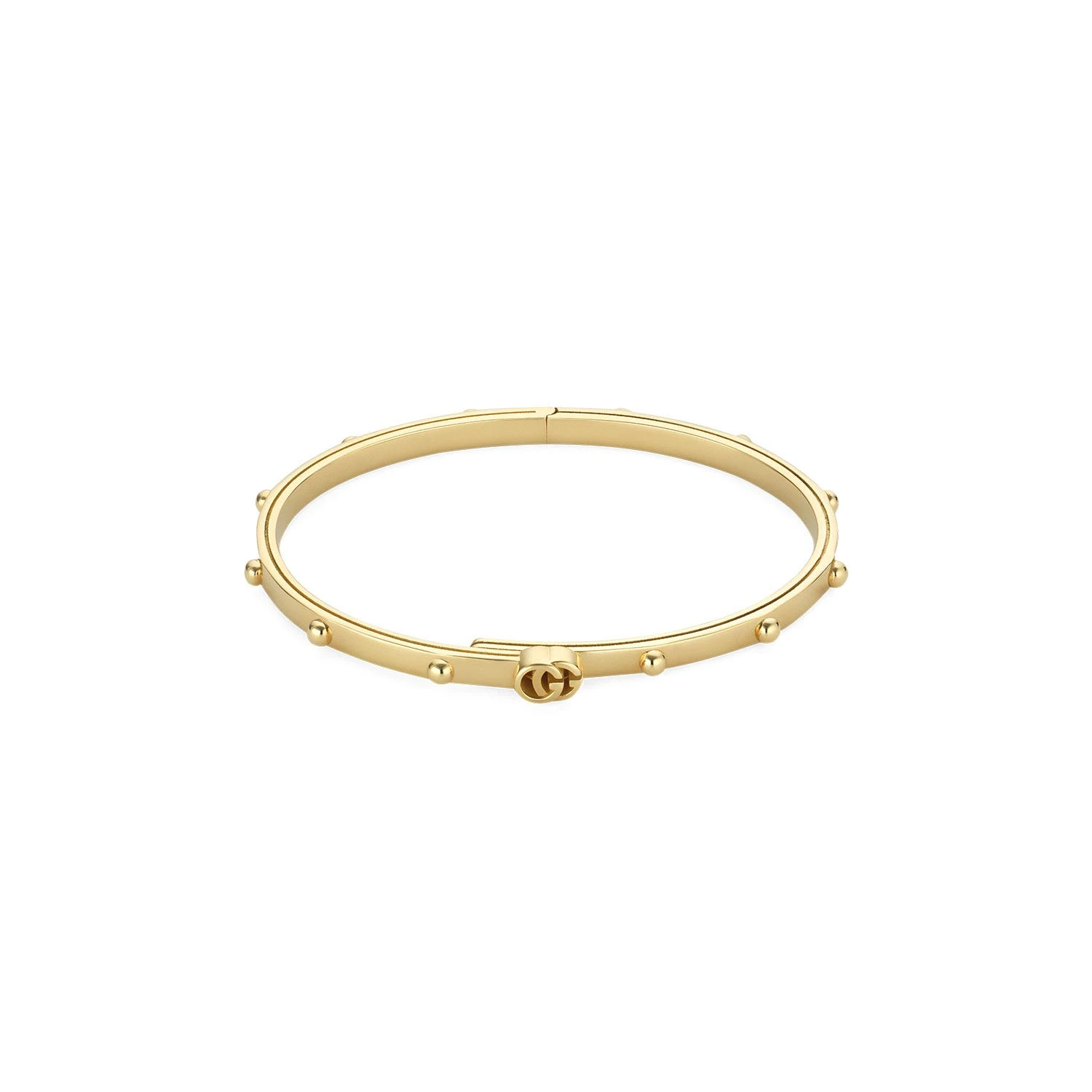 A slim bangle in 18k yellow gold is dotted with rounded studs. At the center is the Double G detailβa distinctive House code presented in a subtle way.