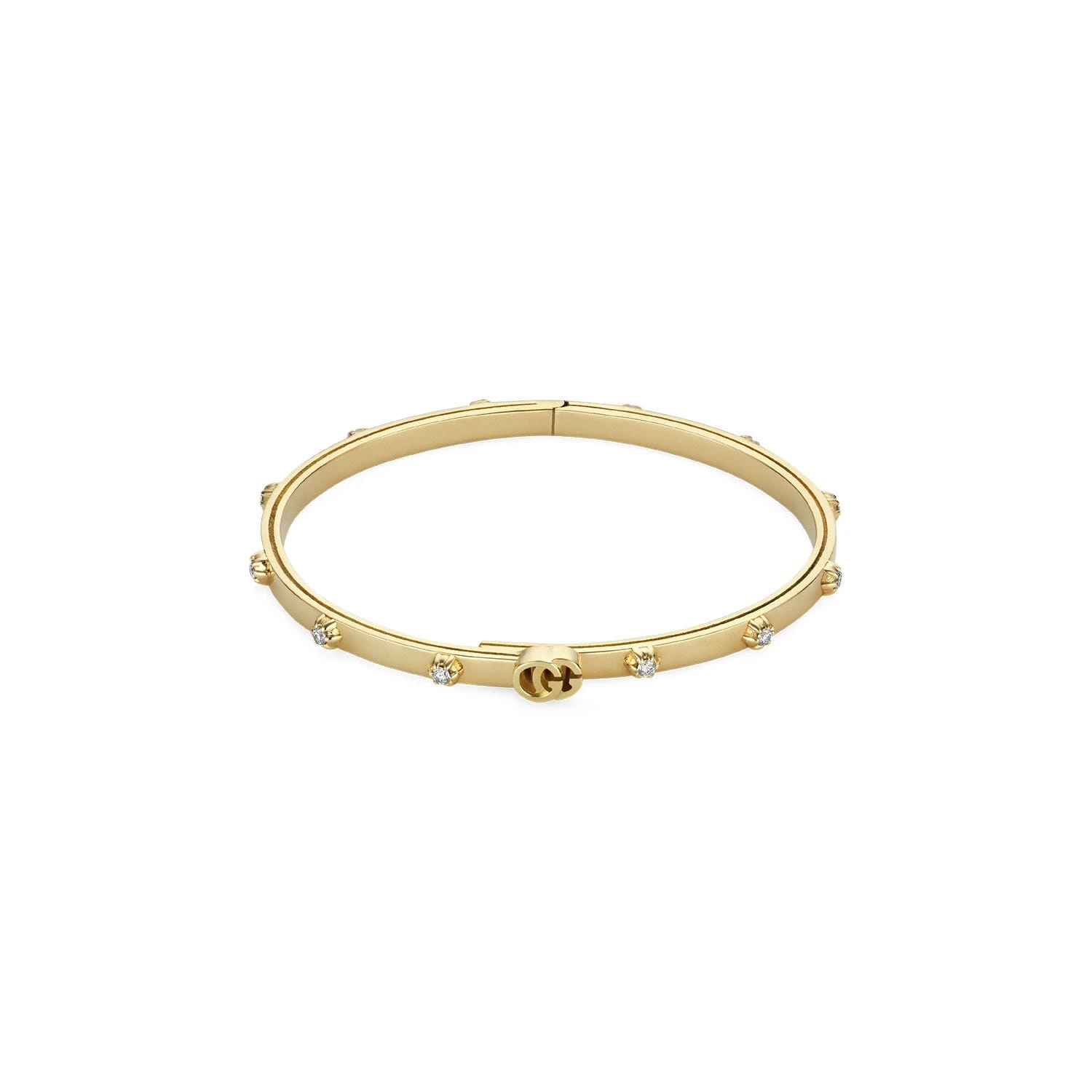A slim bangle in 18k yellow gold is dotted with sparkling white diamond studs. At the center is the Double G detailβa distinctive House of Gucci code presented in a subtle way.