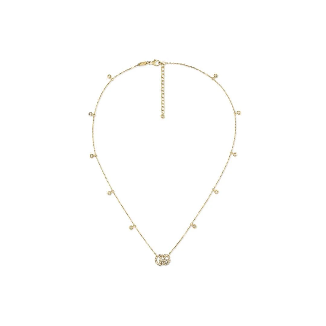 The Double G, inspired by an archival design from the ’70s-a hallmark era of the House of Gucci -is elevated in 18k yellow gold encrusted with diamonds. Diamond pendants along the delicate chain further enrich the design.