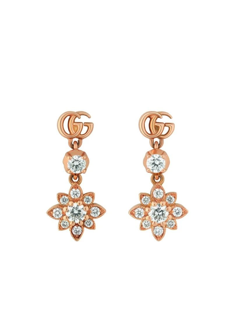 The Gucci Flora line plays with the origins of its name to present a selection of pieces with botanical inspirations. Rose gold floral details enriched with diamonds appear alongside the emblematic Double G logo, defining these Gucci Flora GG Station Dangle Earrings with a romantic feel.