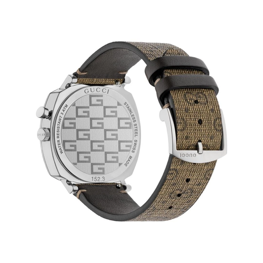 A clean, streamlined design that fits snugly around the wrist, the Grip watch takes its inspiration from the world of skateboarding, its name recalling the way the rider’s sneakers stick to the grip tape on a skateboard. Designed for a gender-neutral appeal, the contemporary 38mm stainless steel face has two windows to display the hour, minute and the roulette, completed with a GG Supreme canvas strap.