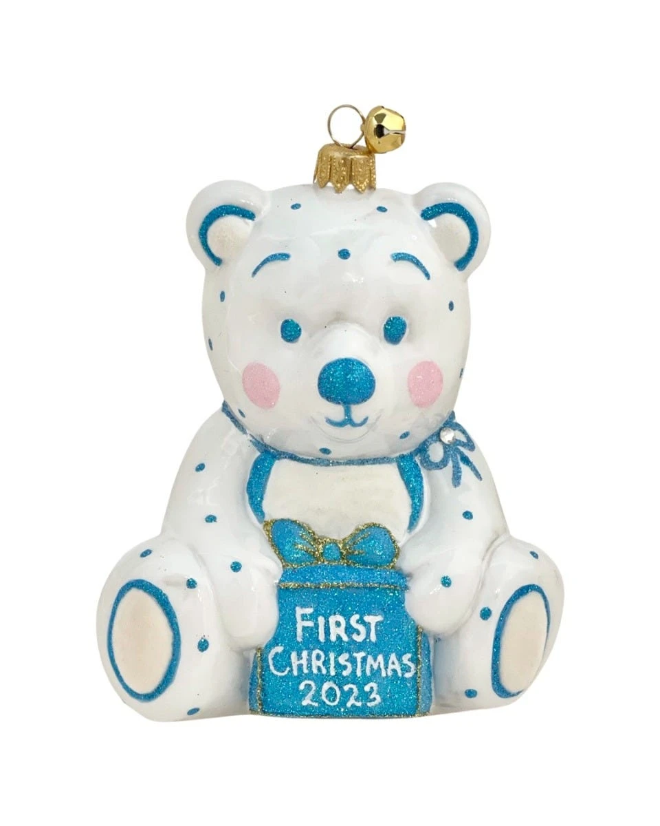 Exquisitely hand painted by artisans from Jinglenog – the His First Christmas Ornament features white bear holding a blue glitter ‘First Christmas 2023′ present.