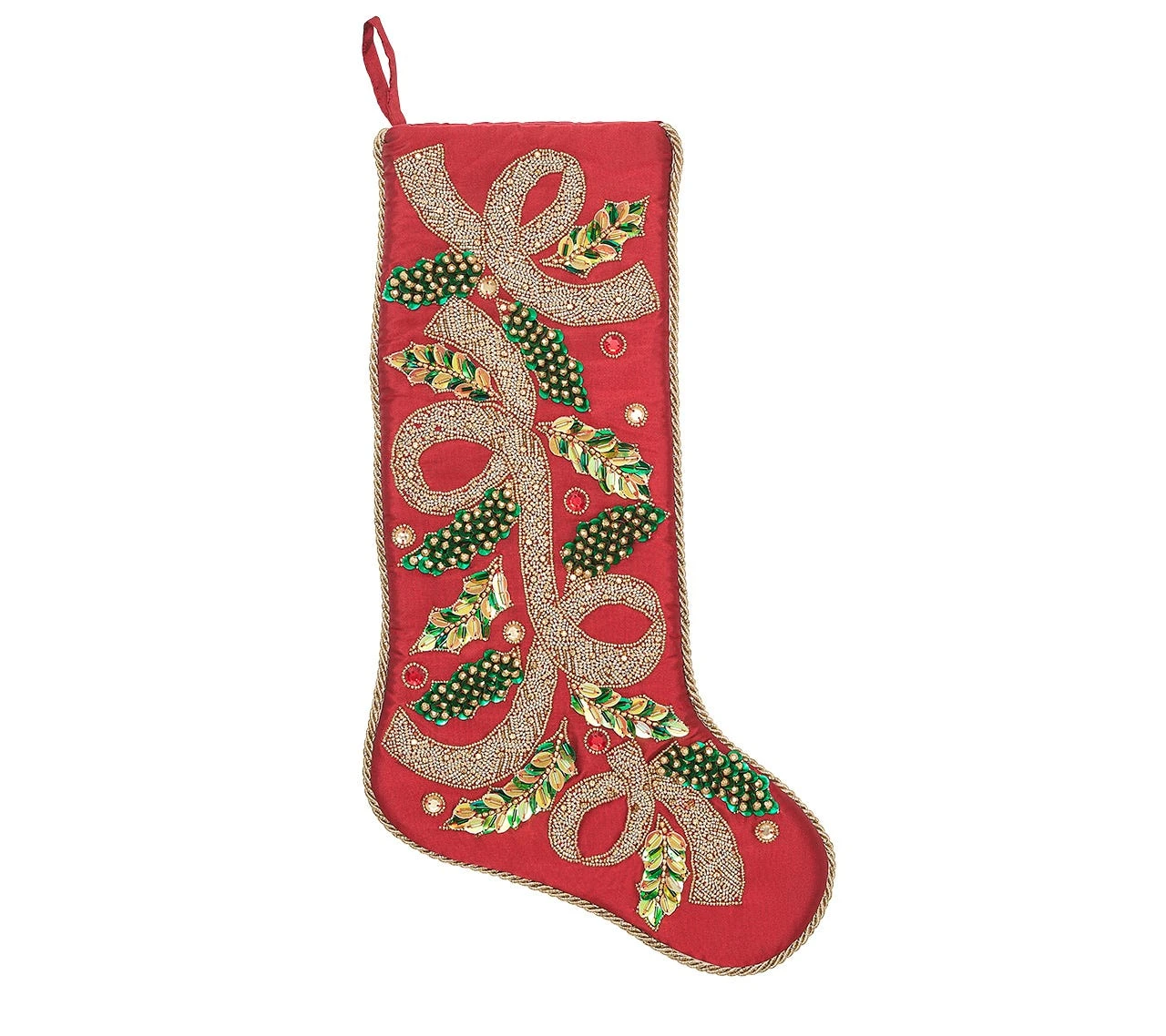 What if stockings were as exciting as the presents they hold? The classic Holly Stocking from Kim Seybert features a flowing hand-beaded ribbon and decorative Christmas boughs. With expert hand-beading and folded sequin details, this is the perfect luxe accessory for a fireplace display–and to kick off the holiday decorating spirit in spectacular fashion.
