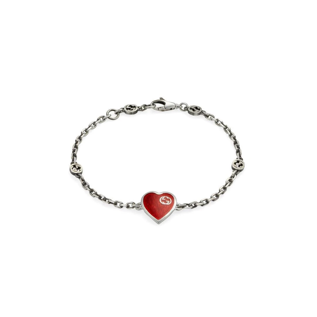 From its intricately engraved stencil heart pendant to its woven link chain, the emblematic Interlocking G symbol defines this sterling silver bracelet. Giving the classic motif a bright and playful twist, in true Epilogue fashion, is red enamel.