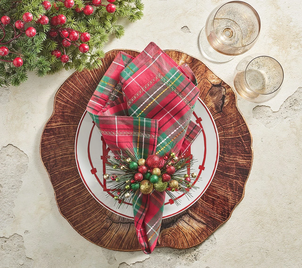 Add a touch of sparkle and joy with the playful Jingle Napkin Ring in red, green & gold from Kim Seybert. This seasonal edition–a cluster of holiday ornaments and pine sprigs inspired by a bedecked Christmas tree–sets the rhythm for any festive holiday celebration.