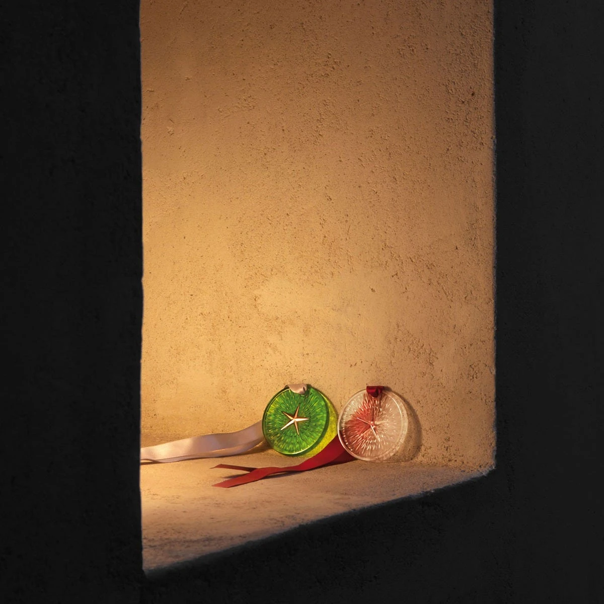 Little feathers blown by a breeze and just in time for Christmas celebrations, settled on clear, red and amazon green crystal ornaments. A star dazzles bright in the center.