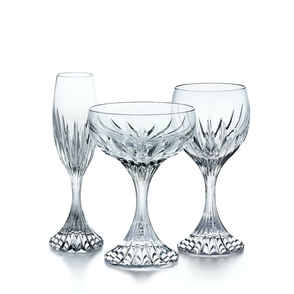 The Massena glass showcases Baccarat’s meticulous craftsmanship. Deep orgue bevel cuts are etched directly into the crystal, irradiating from the foot of the glass to the base.