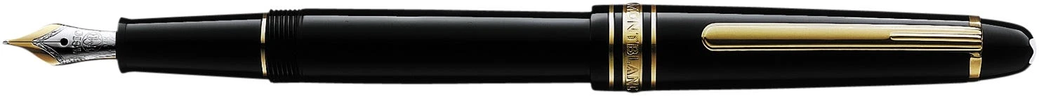 Clip: Gold coated clip with individual serial number Barrel: Black precious resin Cap: Black precious resin inlaid with Montblanc emblem Type: Fountain pen with piston converter Nib: Hand crafted Au585/14 K gold nib with rhodium coated inlay |
