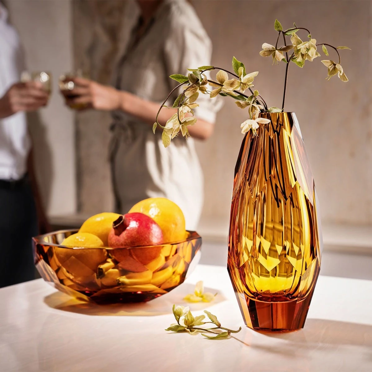 This beautiful topaz Cubism Bowl by Moser is a unique statement piece. Designer Rony Plesl followed delicately in the wake of the Moser tradition of cut glass from the 1930s. The manual cut in cubist style creates an impressive play of light and dark on the polished facets, while the Moser colors elegantly complement the beauty of the cut crystal. Its artistic expression and size make the bowl a striking landmark of every interior.