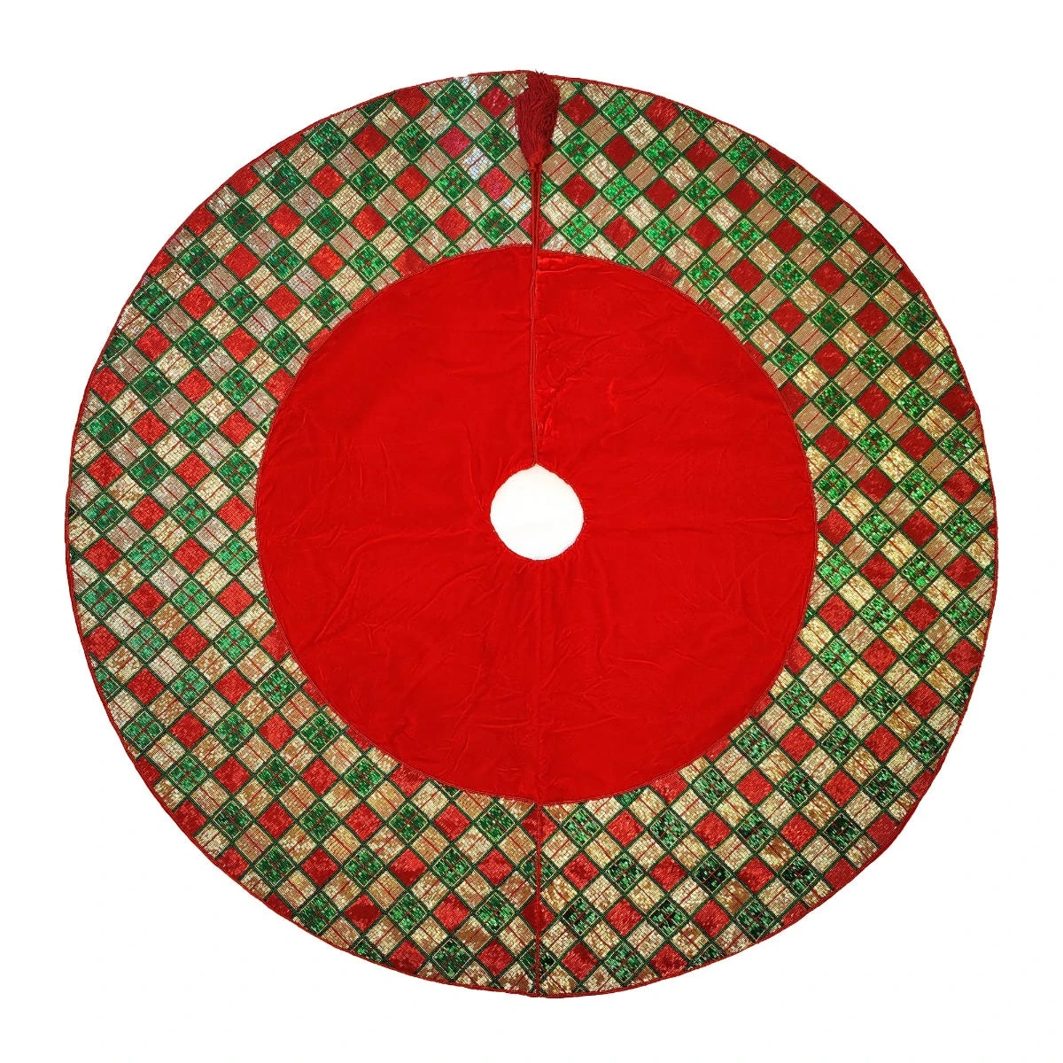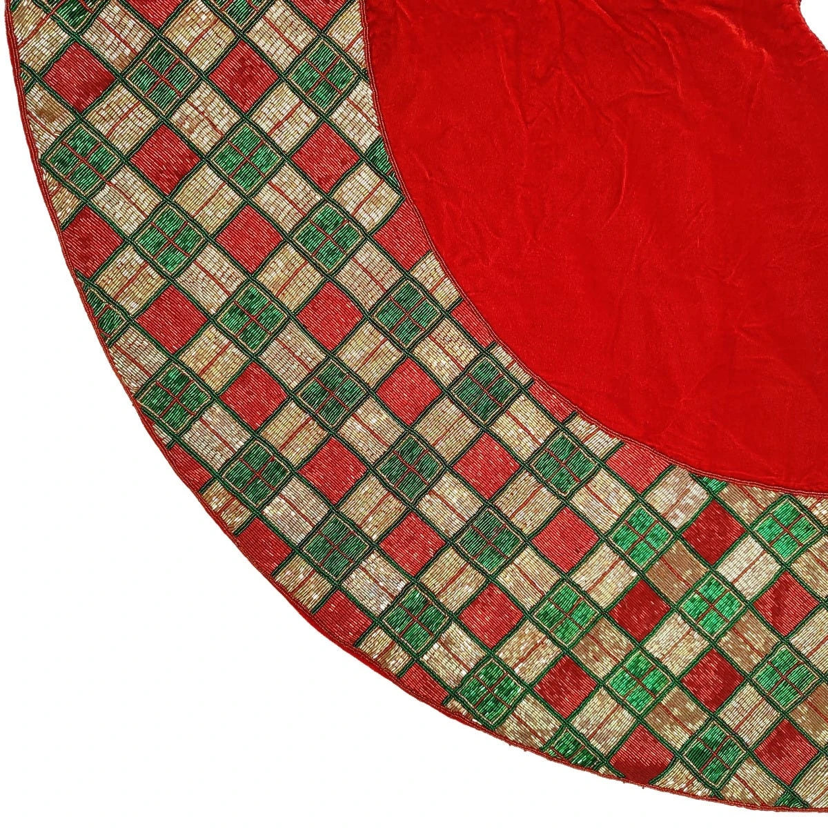 Celebrate the Christmas season with this Red Tree Skirt with Tartan Plaid Beading by Sudha Pennathur – a beautifully festive addition to your collection of holiday decorations this season!