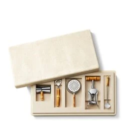 Beautifully presented in a shagreen lidded box with a contemporary round-edge silhouette and lined with suede, this deluxe Aerin Shagreen Bar Tools Set in cream color includes the following tools: a jigger, bottle opener, strainer, wine opener, and stirrer. Crafted in stainless steel, each tool includes a real bamboo handle, providing a casual elegance that is perfect for entertaining at home. Ideal for any setting, the set can be showcased in your home bar or given as a gift to your favorite cocktail connoisseur in celebration of a special occasion.