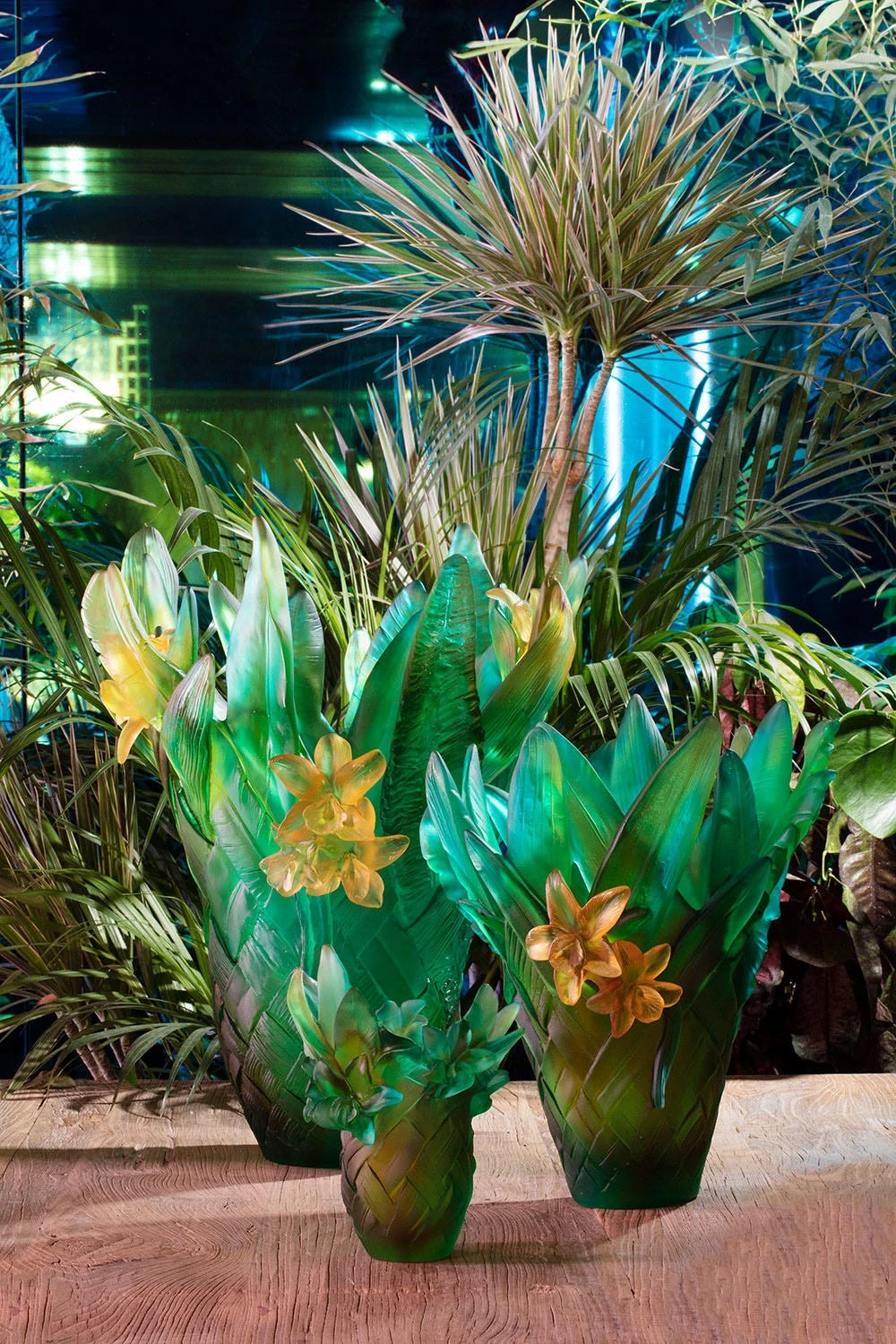 Evoking feelings of Indonesian and Caribbean tones, the Tressage vase from Daum begins with beautiful basketwork before exploding in a riot of fauna.