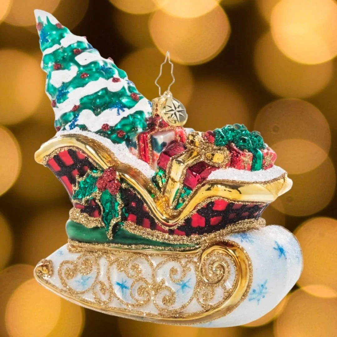 This delightful Snowy Sleigh Ride Ornament is packed to the gills with everything you need for a joyful Christmas, even the tree. A wonderful gift idea for a friend, it is also a fun & whimsical piece to adorn your own Christmas tree this holiday season.