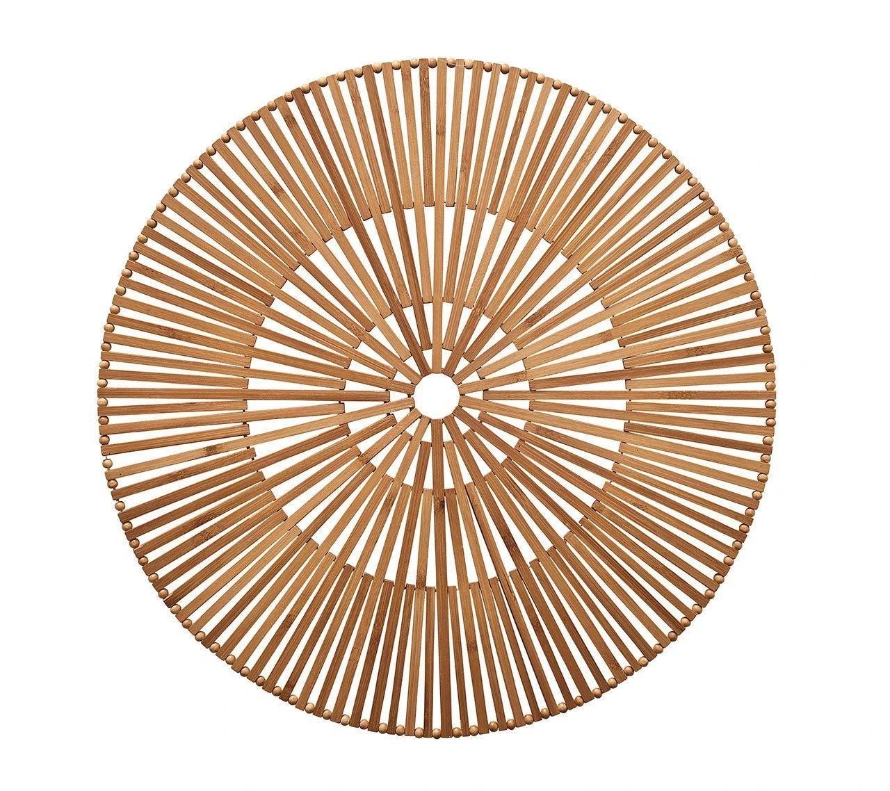 The round Brown Spoke Placemat is a nod to the Eastern world with its hand-cut bamboo slats arranged in a geometric pattern. The bamboo slats are arranged by hand in this round bamboo placemat making it the perfect blend of clean, refined lines and natural organic elements. This brown bamboo placemat works well in any table setting from casual to refined dinners. Sold in sets of four placemats.