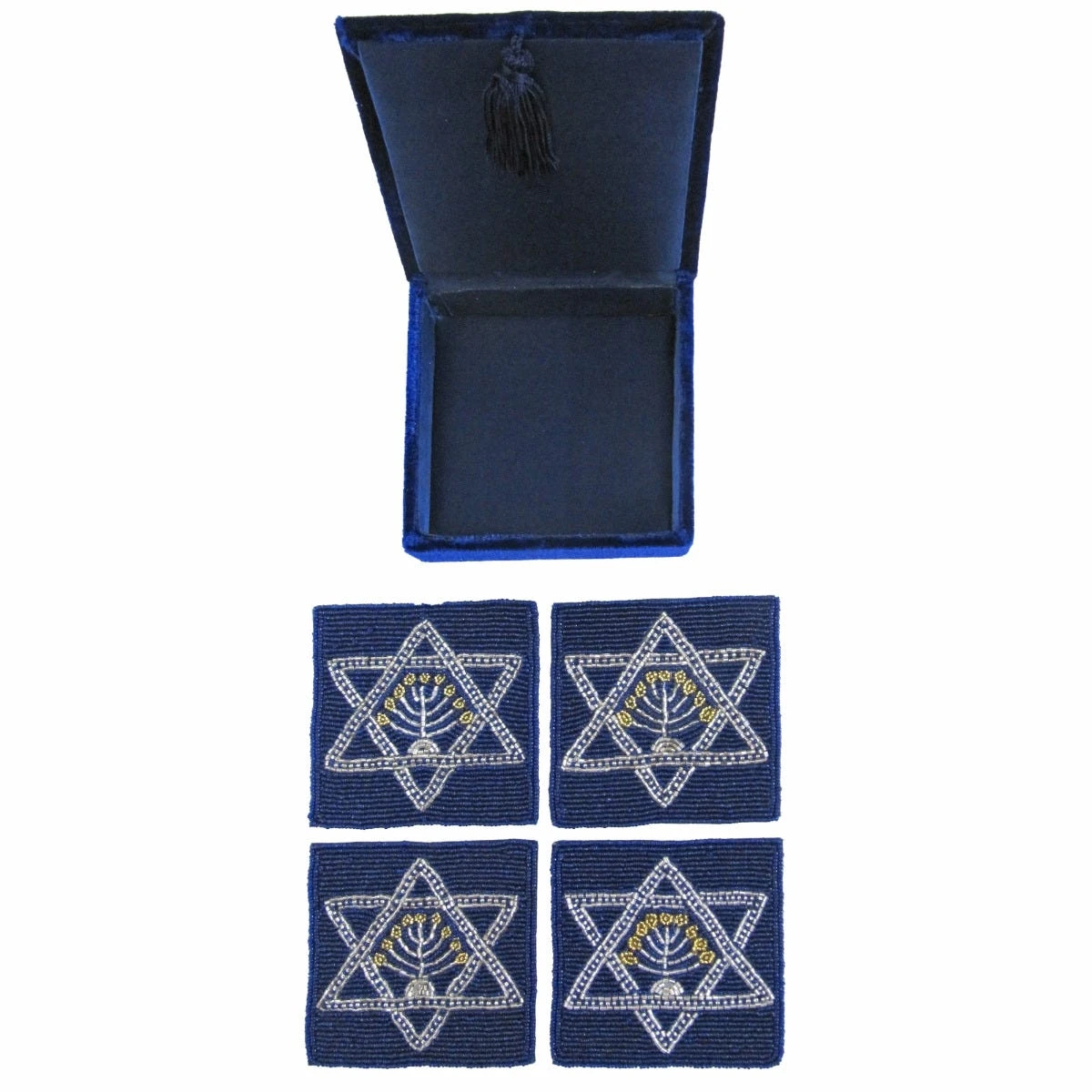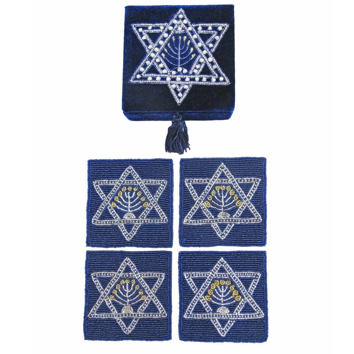 Celebrate the Christmas season with this Star of David Beaded Coaster Set of 4 in a Velvet Box by Sudha Pennathur – a beautifully festive addition to your collection of holiday decorations this season!