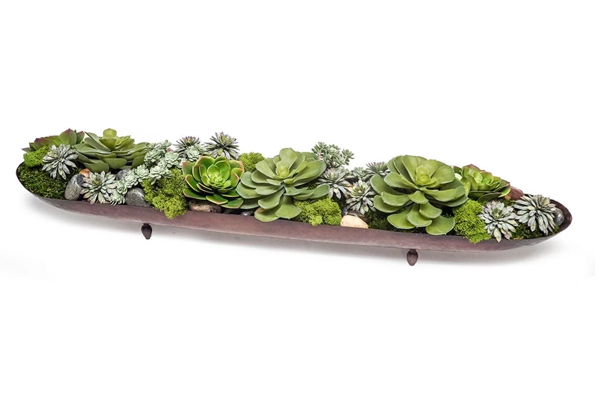 A great alternative to fresh flowers, the Succulent in Large Copper Boat arrangement has the look and feel of a real bouquet. It is a great way to brighten up any home or office space, and it is perfect to give as a beautiful gift.