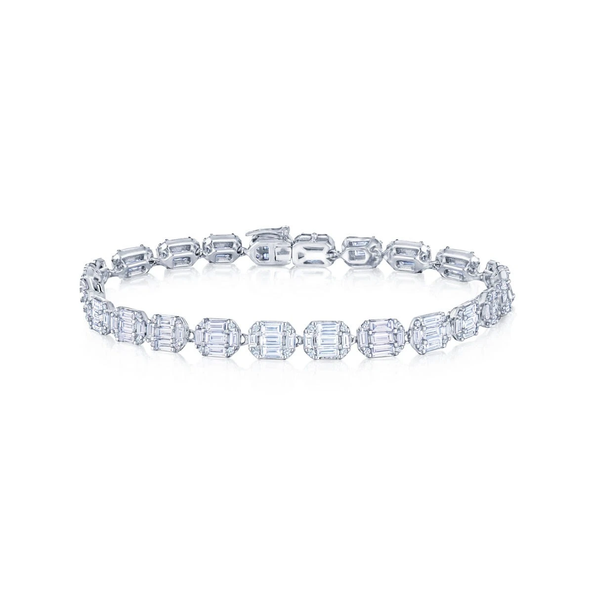 Kwiat’s Sunburst Line Bracelet features a mélange of emerald-cut and round brilliant diamonds fit together like puzzle pieces to create the effect of a larger emerald-cut stone. Each one is absolutely dazzling, thanks to Kwiat’s peerless cutting standards. Skilled craftspeople handcraft the linked bracelet of 18k white gold to allow maximum light to enter the diamonds, amplifying their brilliance.