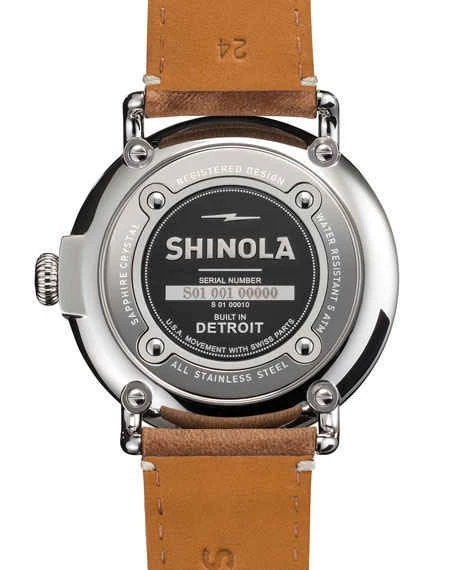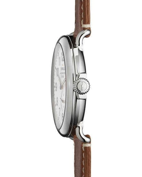 47mm stainless steel case with double curve sapphire crystal. Topstitched leather strap with buckle. White dial with Arabic numerals, hour markers, and luminous hands. Hours, minutes, small seconds. Detroit-built Argonite 1069 quartz movement with Swiss parts. Water resistant up to 50 meters (5ATM/160 ft.). |