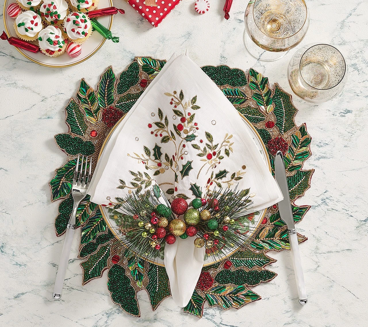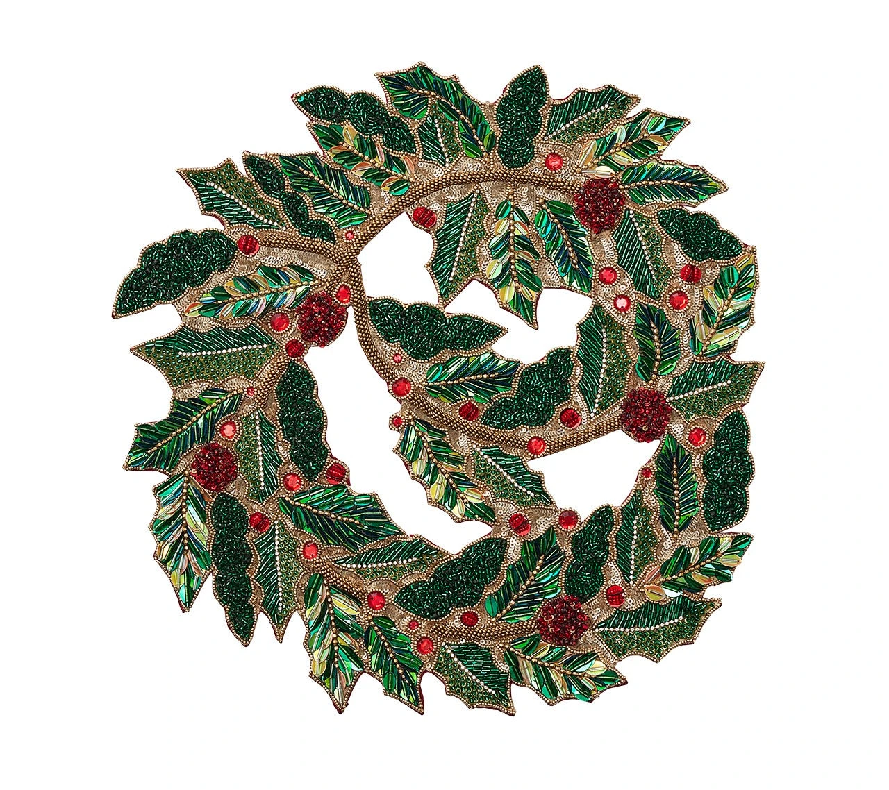 Tis the season to be jolly, and the Tidings Placemat in red, green & gold from Kim Seybert brings holiday spirit to the Christmas table in a big way. Inspired by traditional boughs of holly, more than 20 different beads and sequins are used to create the detailed greenery, accented by red gemstones. Equal parts traditional holiday decoration and glamour, the beaded Tidings Placemat is a seasonal stunner. Complete this holiday look with the coordinating Tidings Runner.