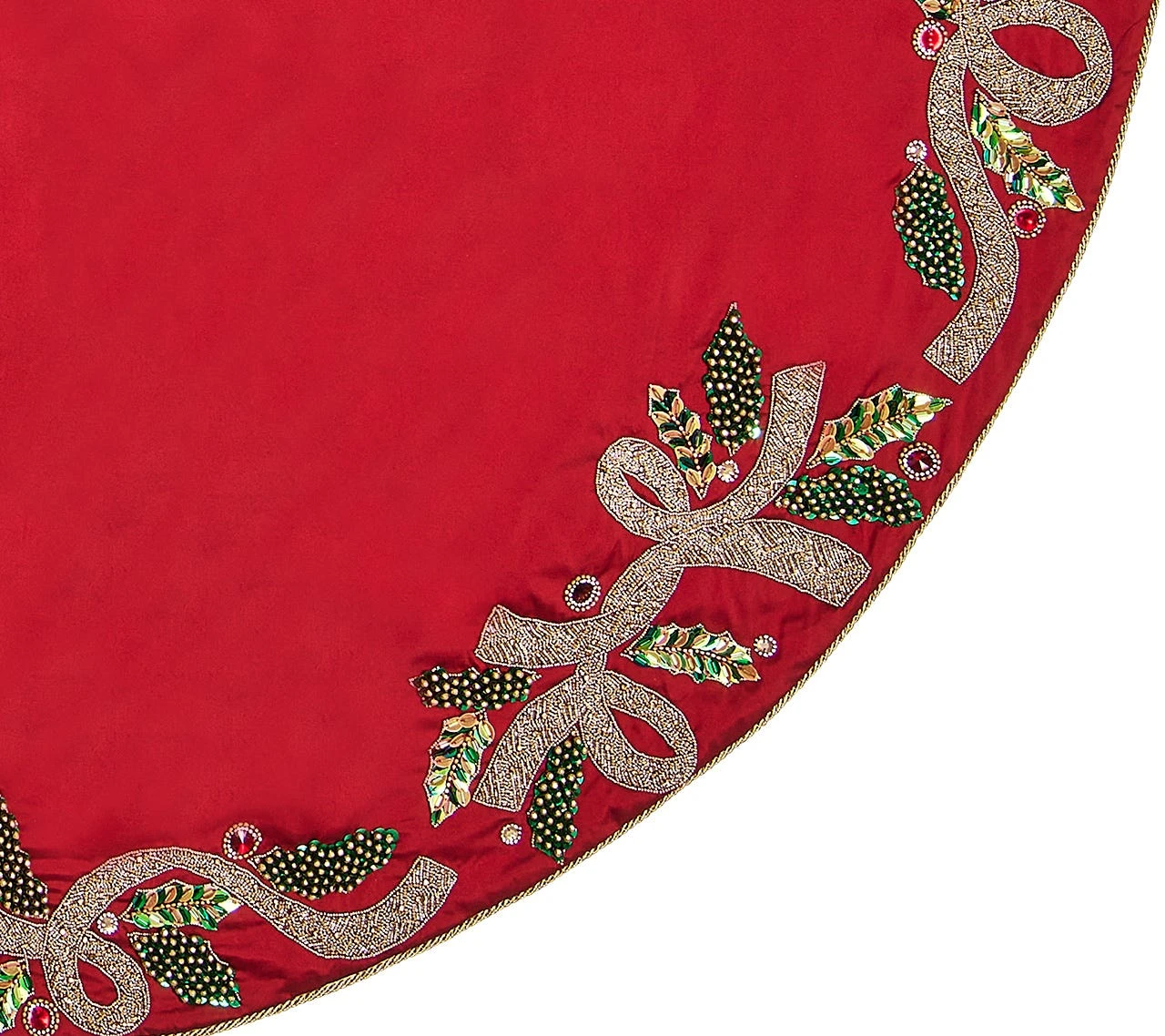 The classic Kim Seybert Tidings Tree Skirt in red, green & gold delivers on the “merry and bright” note of the season, with its border of flowing beaded ribbon and decorative Christmas boughs. The classic holiday red edition–with exquisite hand-beading and luxe folded sequin details–is the finishing touch to an elegant Christmas display. Pair this tree skirt with the coordinating Tidings Stocking.