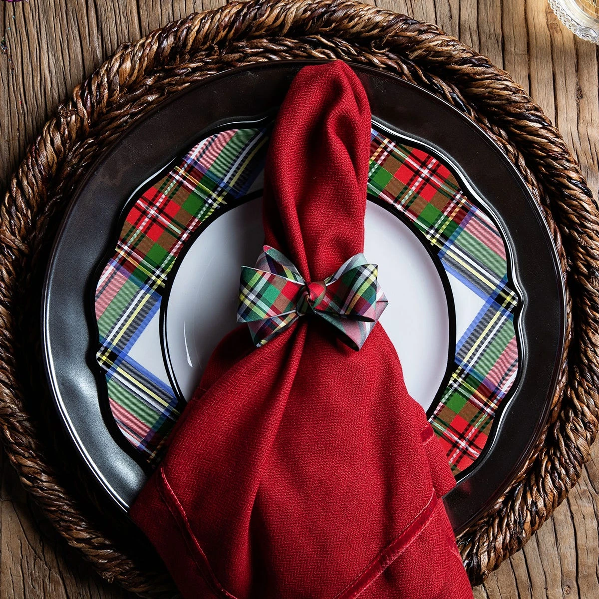 Juliska’s Stewart Tartan Tuxedo-inspired napkin ring was designed to dress up any Holiday place setting. Handsewn with rings wrapped in soft velvet ribbon, these handsome tartan bows will adorn any table with festive flair.