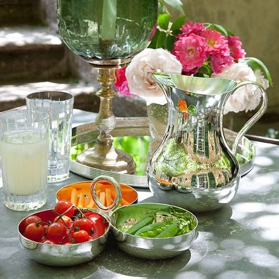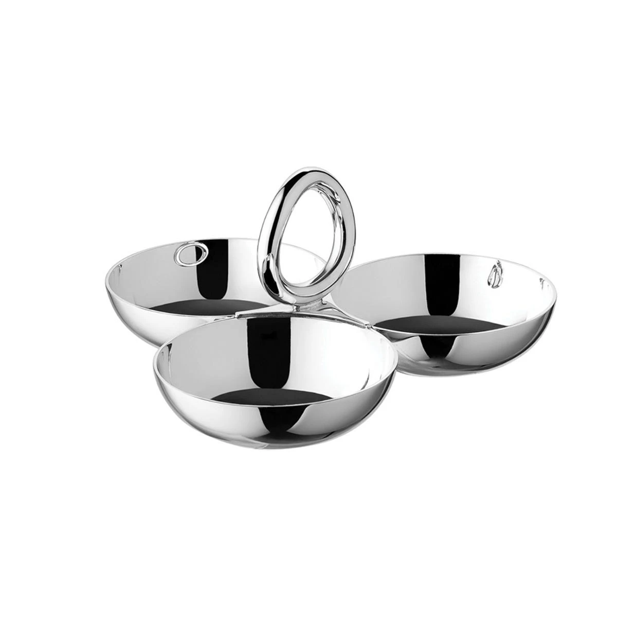 The three-bowl silver plated Christofle Vertigo server with a center handle is perfect for serving snacks like nuts, olives or candy or could be used as a trinket catchall. Vertigo’s bold motif — a subtly asymmetrical, thick ring often placed playfully askew — can be found on every piece in the collection designed by Andrée Putman.